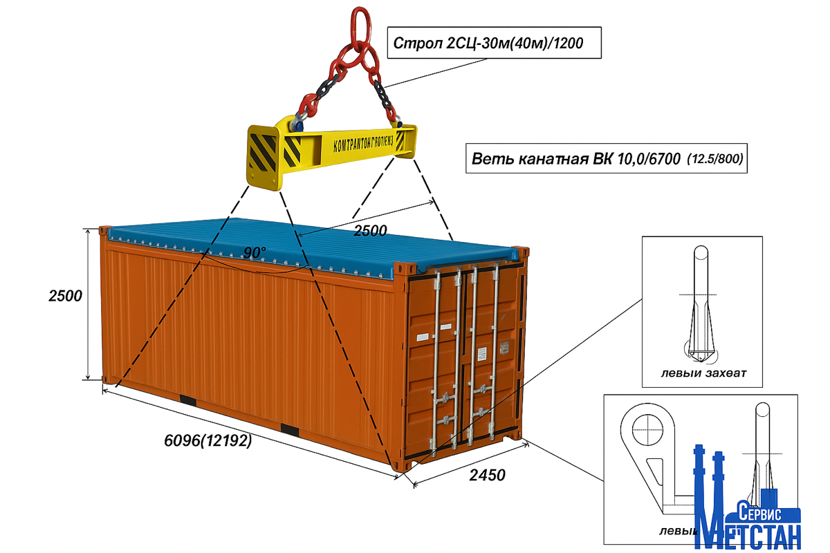 Траверса контейнерная предназначена для подъема и перемещения стандартных 20- и 40-футовых морских контейнеров при помощи грузоподъёмных кранов. Конструкция выполнена на базе траверсы типа ЛП-2, дополненной четырьмя прочными канатными стропами.